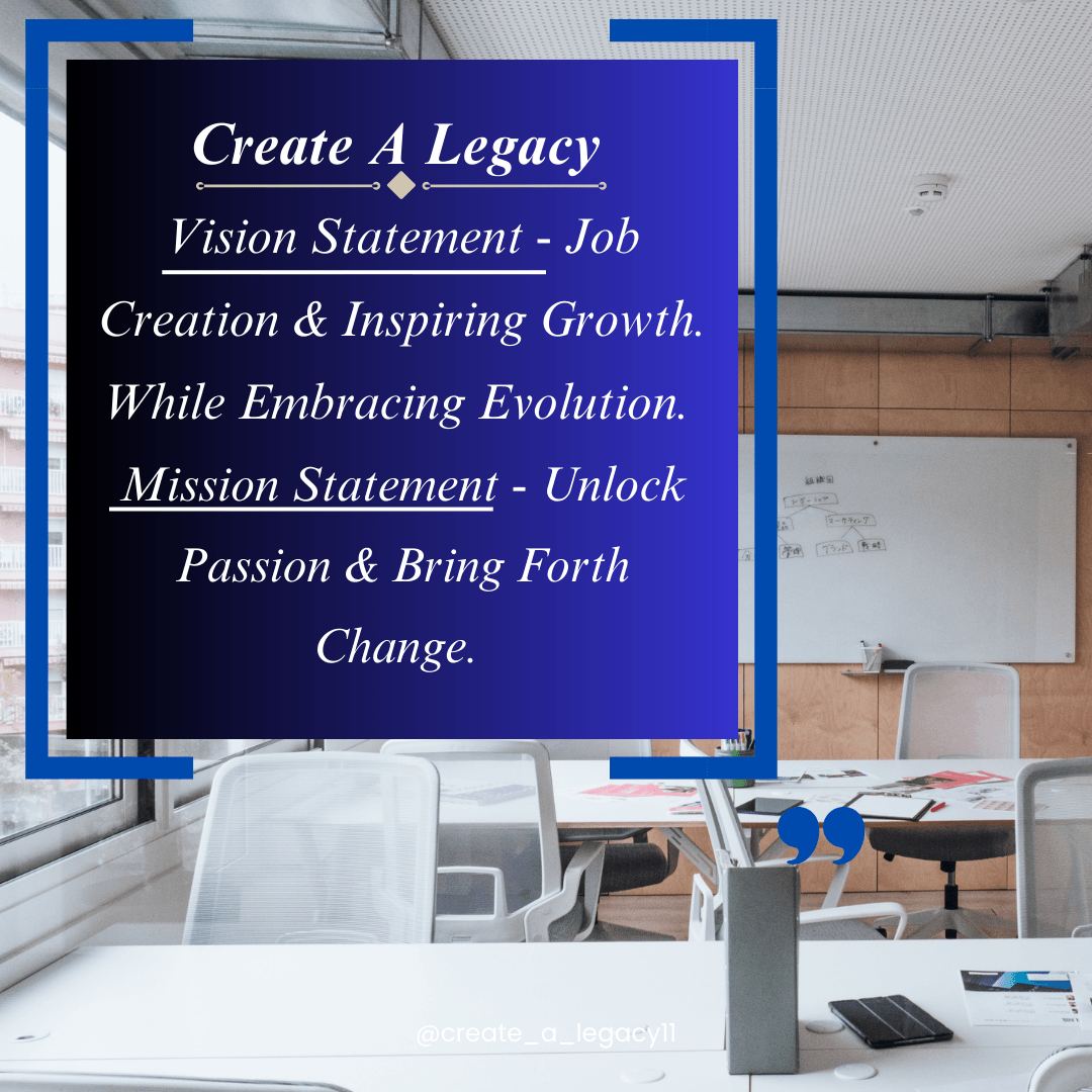 Create A Legacy's vision is to help better the lives of those around us by helping and assisting with online opprtunities as well as job creation for those who are willing to work and create a better life for themselves.